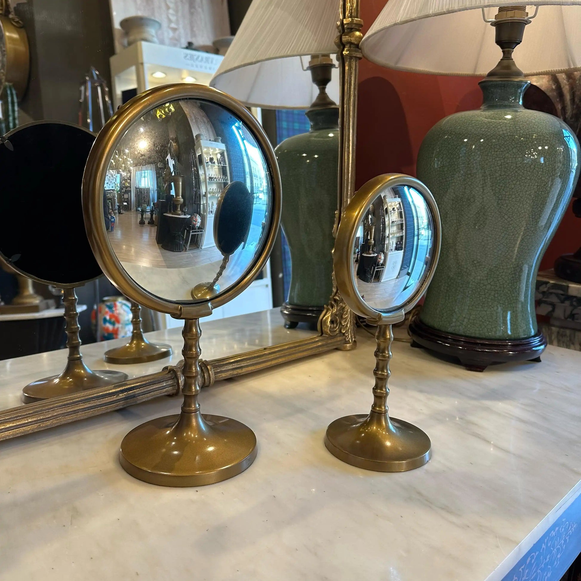 Coppia specchi in metallo bronzato su base.