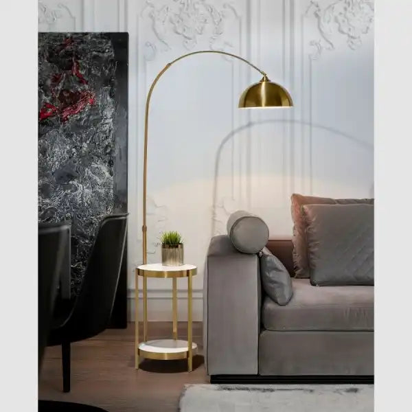 Funzionalità e stile si incontrano in questa raffinata lampada da terra con tavolino integrato, ideale per ambienti sofisticati ed eleganti. Il suo design curvo e armonioso in finitura ottone antico la rende un pezzo di grande fascino, perfetto per soggiorni, angoli lettura o camere da letto.