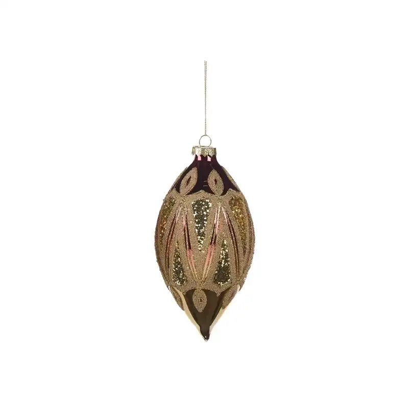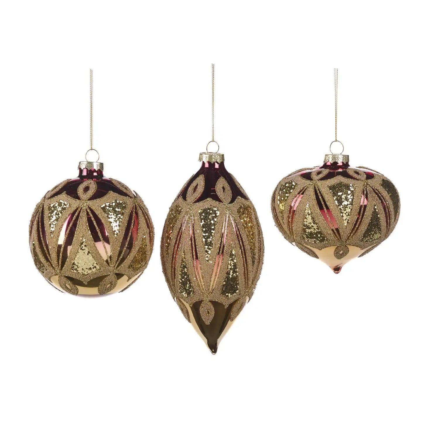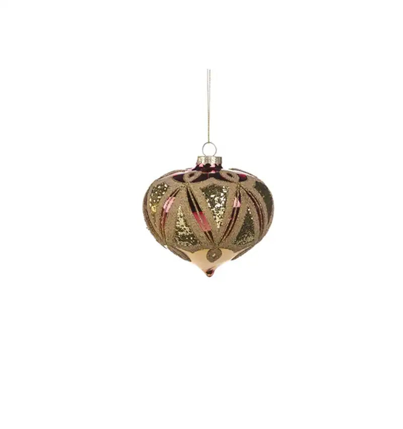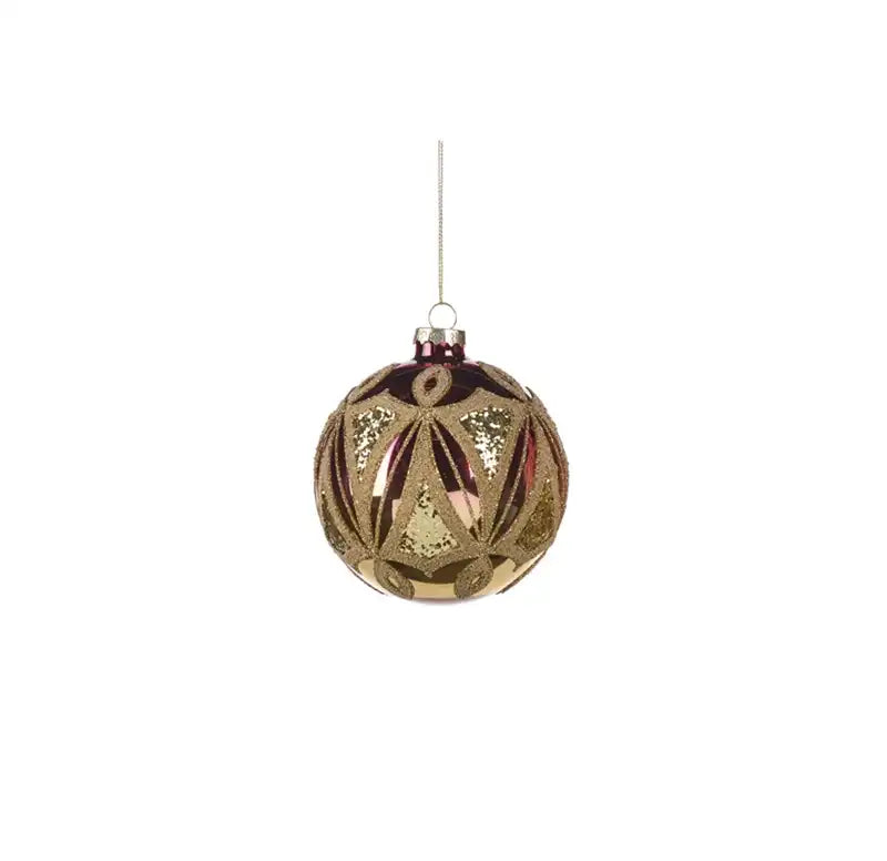 PALLINA IN VETRO BORGOGNA LUCIDO E ORO CON DECORAZIONI ART DECO DIPONIBILE NELLA VARIANTE A SFERA,GOCCIA, CIPOLLA DIMENSIONI: 10CM |