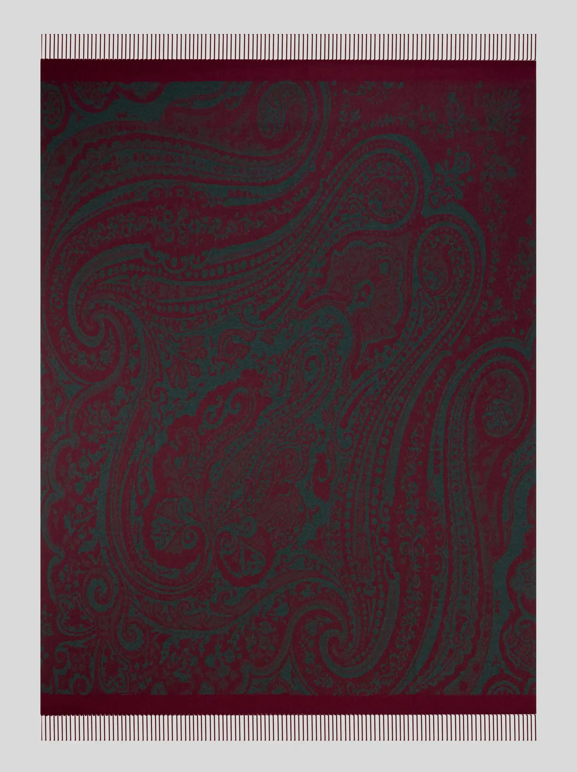 Plaid in lana decorato da un motivo Paisley jacquard a contrasto. L'accessorio è completato da due bordi tinta unita con frange sui lati corti.